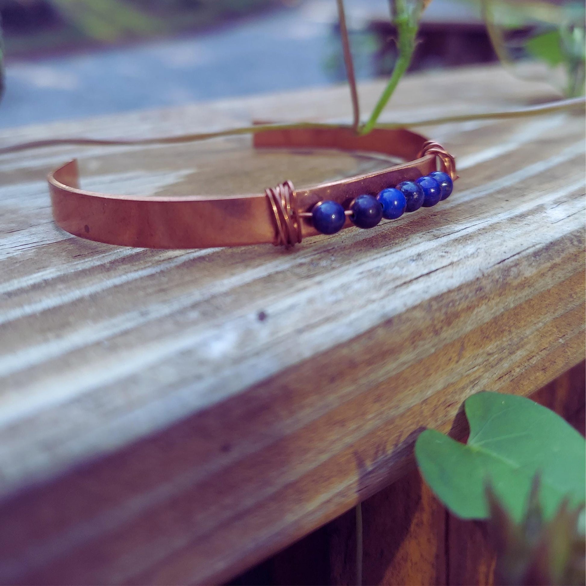 copper cuff bracelet with lapis lazuli gemstones: handmade wisdom, intuition, truth jewelry